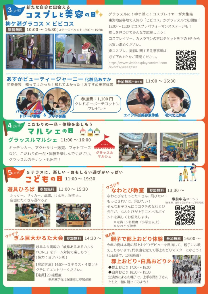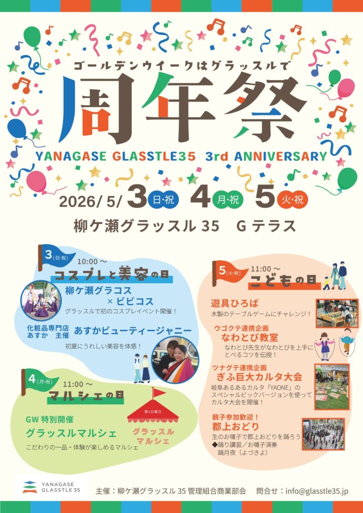 おかげさまでグラッスルは3周年。感謝を込めて、5月3日・4日・5日の3日間、大人からお子様まで皆さんが楽しめる記念イベントを開催します。ゴールデンウィークはぜひ遊びに来てください。