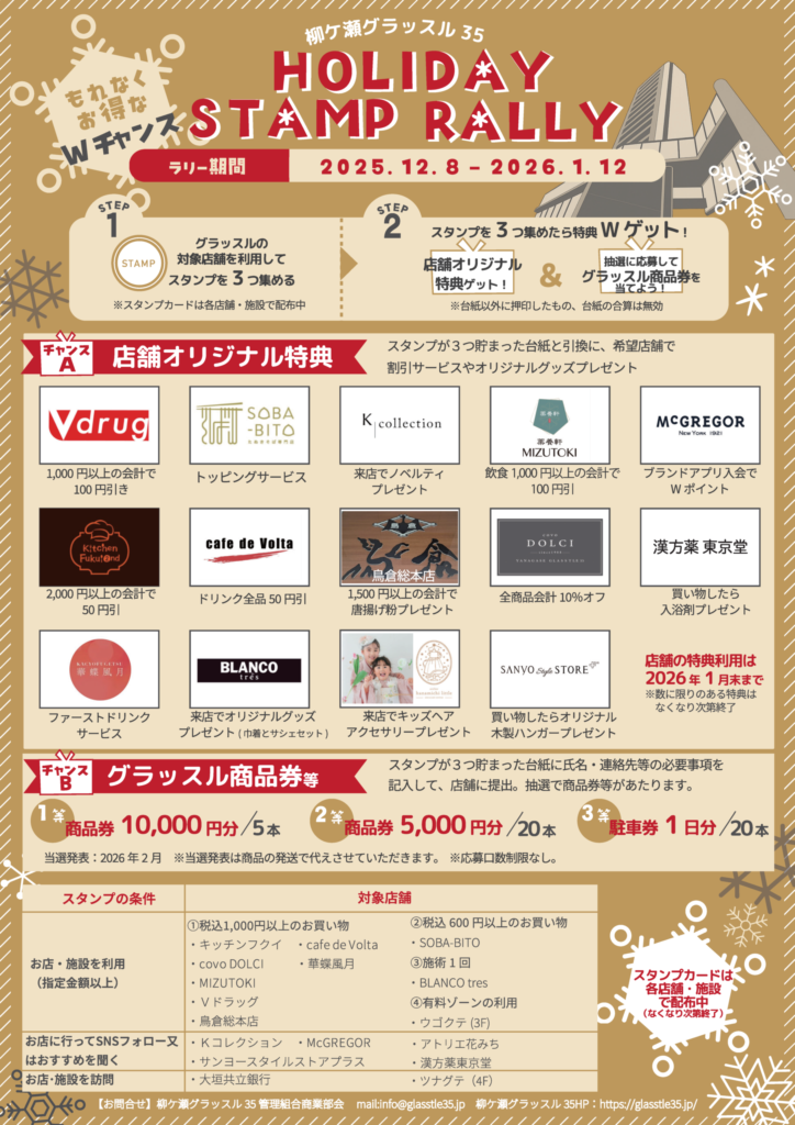 昨年につづき、冬のグラッスル35を楽しんで頂けるように、お得な『HOLIDAY STAMP RALLY』(ホリデースタンプラリー)を、12/8~1/12まで開催します。